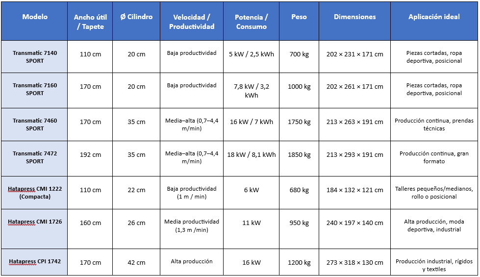 Para ayudarte a comparar de un vistazo las opciones disponibles y elegir la calandra que mejor encaja con tu producción, aquí tienes una tabla clara con las características principales de cada modelo.